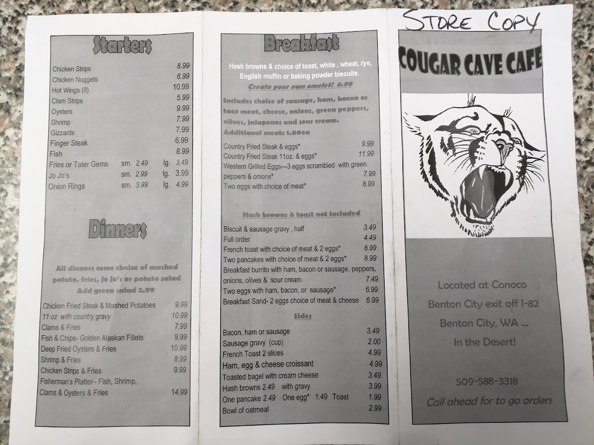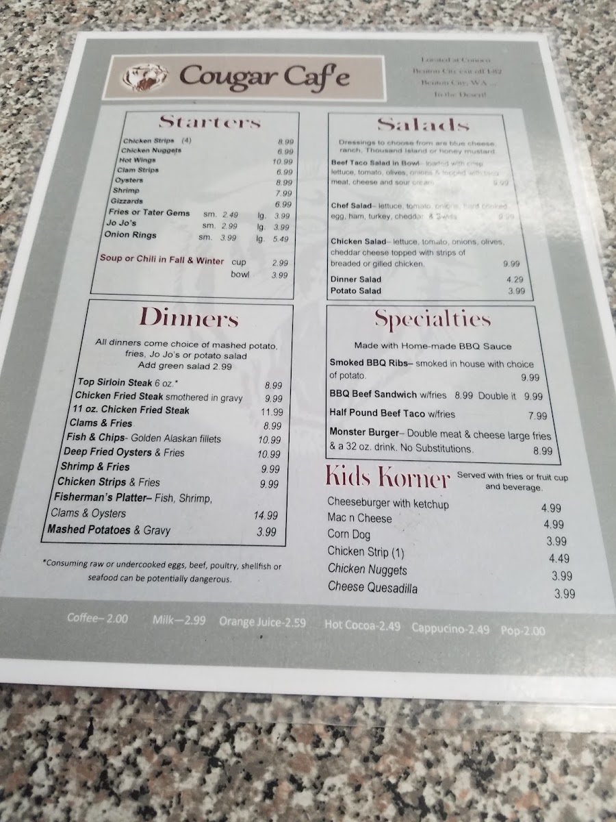 Welcome to Cougar Cave Cafe, where every bite is a celebration of flavor! Nestled at 10806 Kennedy Rd, Benton City, WA, our menu is a treasure trove of mouthwatering specialties just waiting for you to discover. Be sure to try our irresistible Corn Dog, perfectly crisp and bursting with flavor, or tackle the challenge of our giant Monster Burger paired with golden, fluffy fries and our signature fry sauce that will leave your taste buds tingling. Whether you're here for a quick lunch or a cozy dinner, our Cougar Cave Cafe Menu promises to satisfy your cravings and keep you coming back for more!